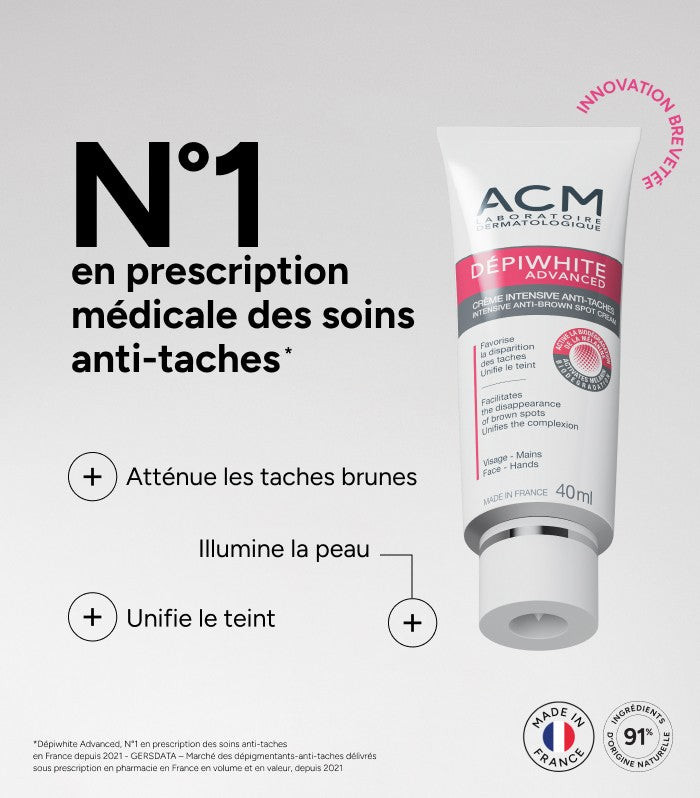 کرم ضد لک دپی وایت ای سی ام ACM DEPIWHITE یک ضد لک قوی فرانسوی با فرمولاسیون جدید و اثر بخشی سریع (2 هفته تا 1 ماه در صورت استفاده منظم) برای درمان لک ها و تیرگی های ناشی از بارداری و زایمان، ملاسما، جای زخم و جای جوش، اثرات سوختگی و لک های ناشی از افزایش سن و آفتاب سوختگی برای خانم ها و آقایان و قابل استفاده برای تمام نقاط بدن از جمله صورت، بدن دست و گردن است.